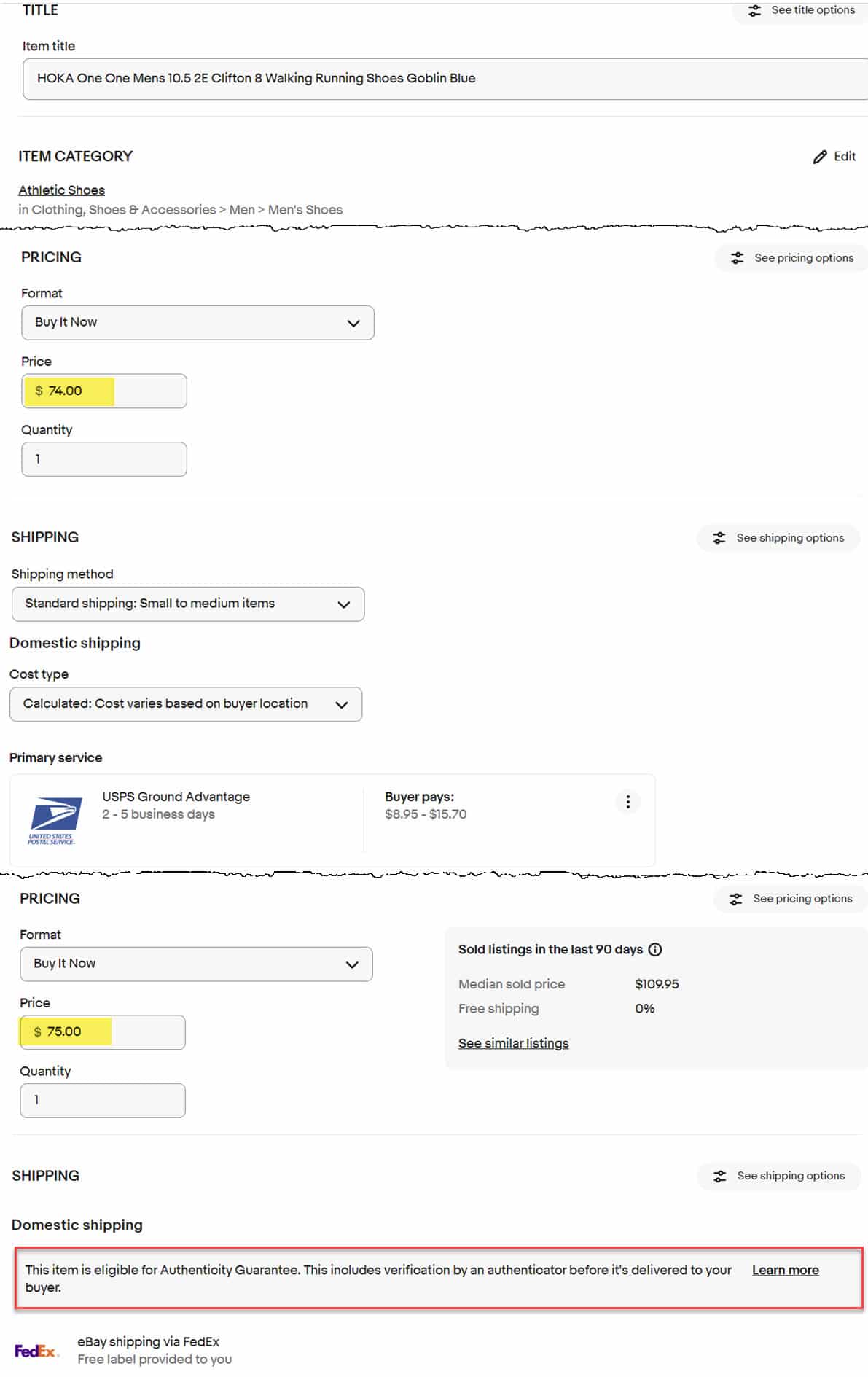For example, when listing a pair if Hoka running shoes, the listing form recognizes and applies Authenticity Guarantee eligibility at a Buy It Now price of $75 and above.