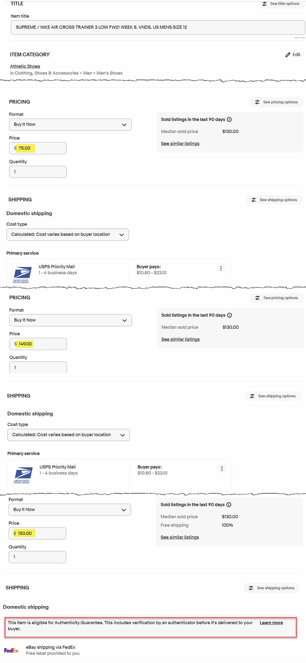 But when listing these Nike cross trainers, the listing form dynamically adjusts and applies a $150 minimum to be eligible for authentication.