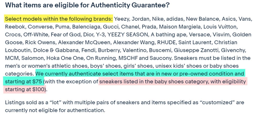This allows eBay to change brand, model, and minimum price eligibility on the fly with sellers only able to determine if their shoes will qualify at any given moment by observing what is shown on the listing form.