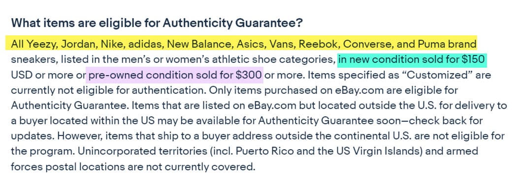 eBay has been quietly making changes to their sneaker authentication program over the last few months - re-enabling messaging between buyers and sellers, implementing dynamic pricing criteria for eligibility, expanding to include PO Boxes and Puerto Rico and clarifying mandatory FedEx shipping label policy.