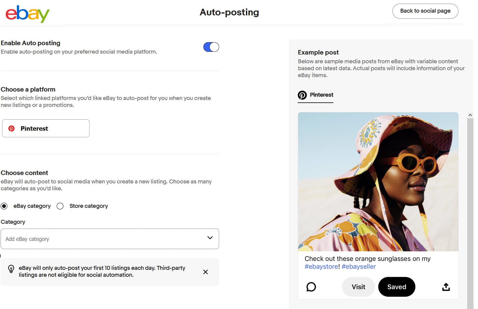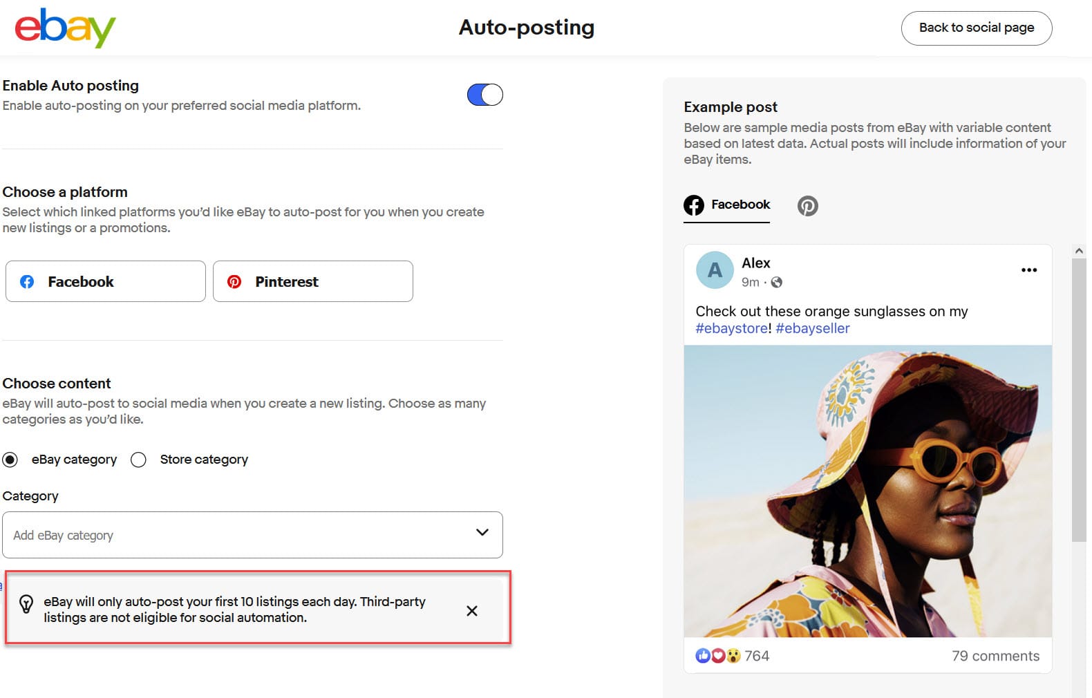 Once you have connected your social media accounts like Facebook and Pinterest, eBay will offer you the option to enable auto-posting.