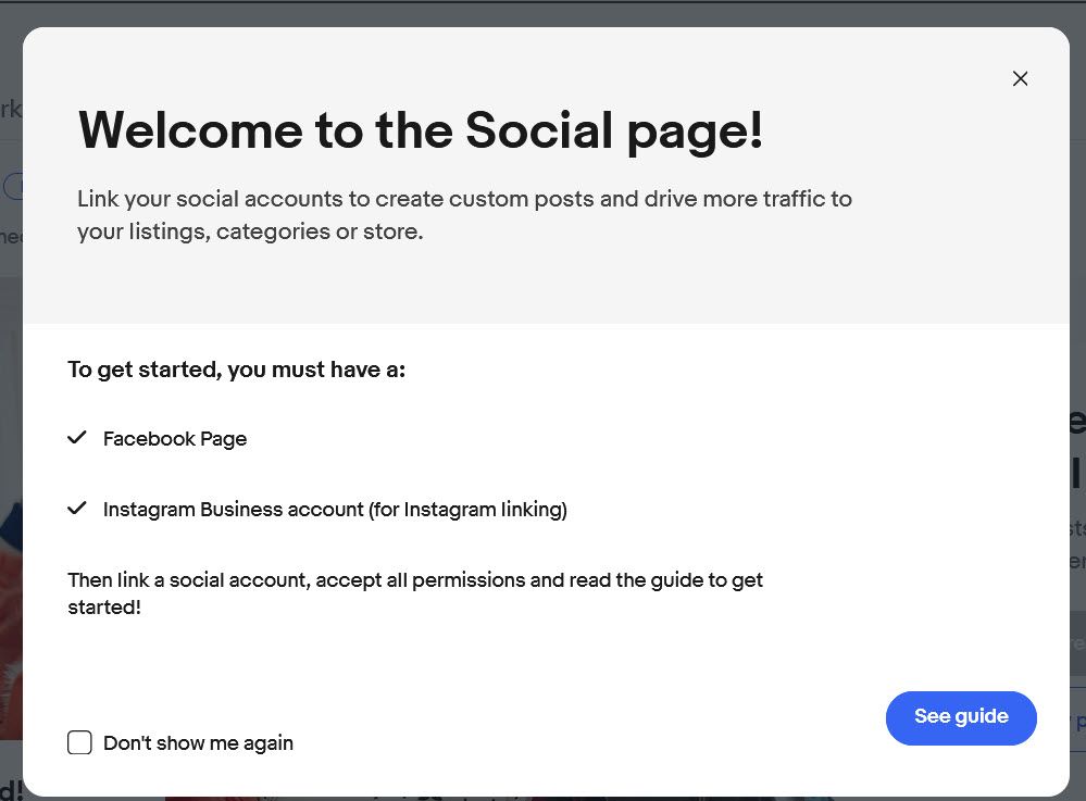 The Social page in Seller Hub allows store sellers to link to their social accounts to create custom posts and share to platforms including Facebook, Instagram, Twitter and Pinterest.