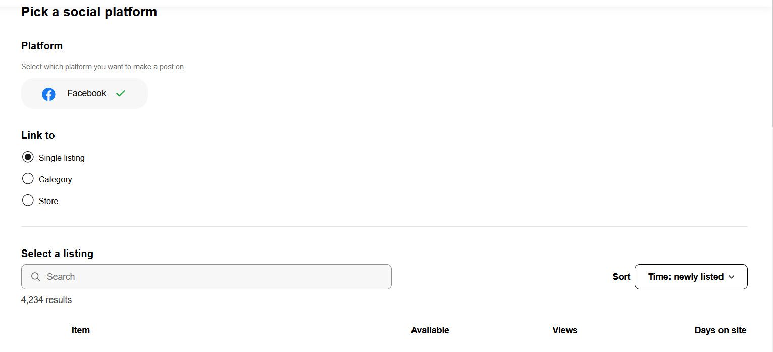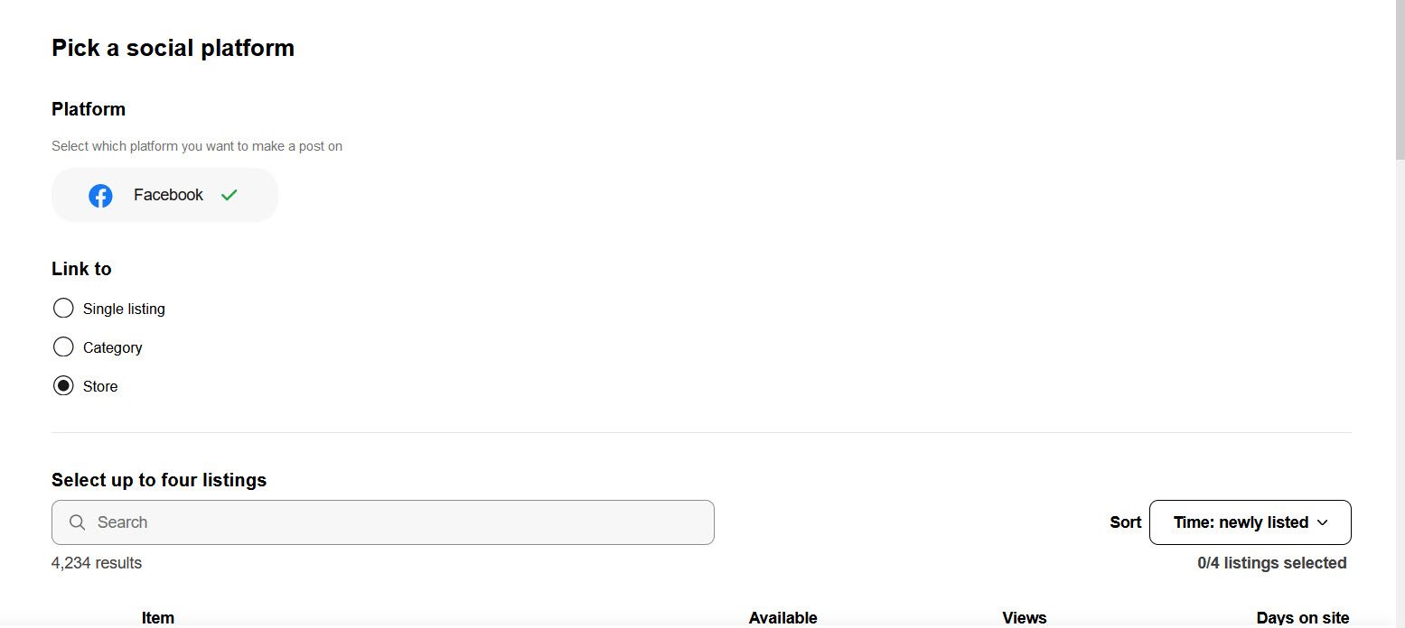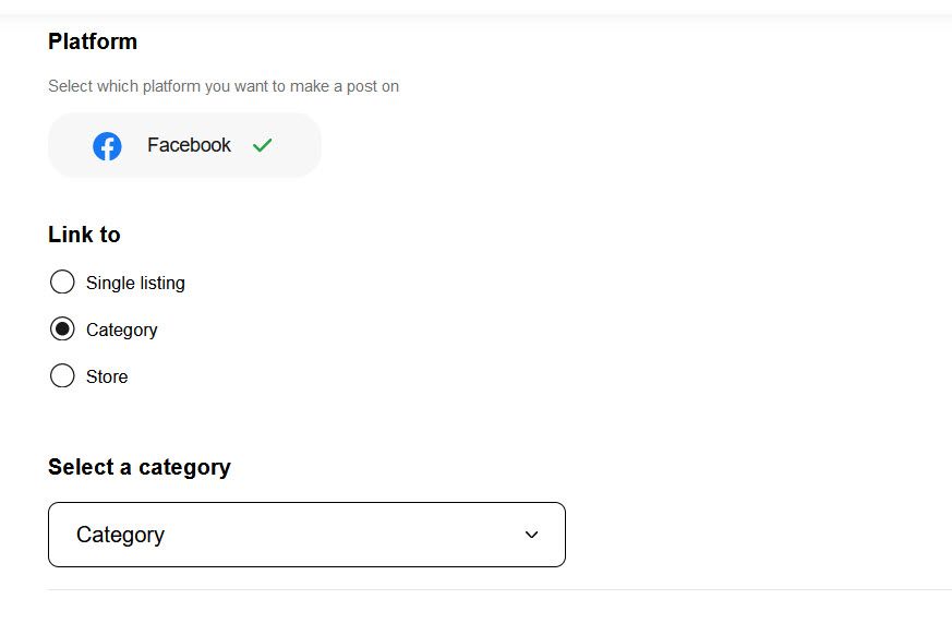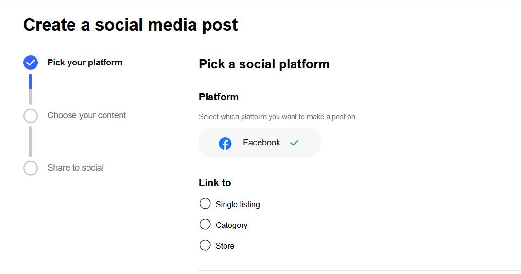 - Next, choose what you want your post to link to and buyers to visit when they see your post - a listing page, your Store, or a Category page