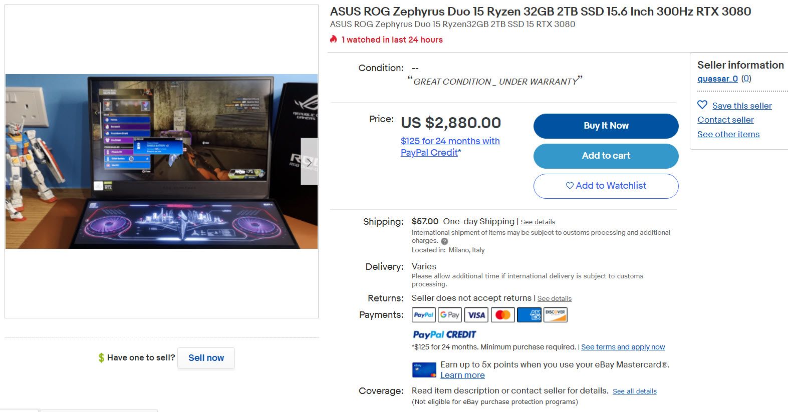 To make it even worse, these sophisticated fraudsters are apparently stealing images from other places on the web in an effort to trick buyers into believing they have the item actually on hand - using either images of the item in a shipping box like the Steam Deck shown above or this Asus ROG Zephyrus Duo 15 that looks like it's just set up on the seller's home office desk.