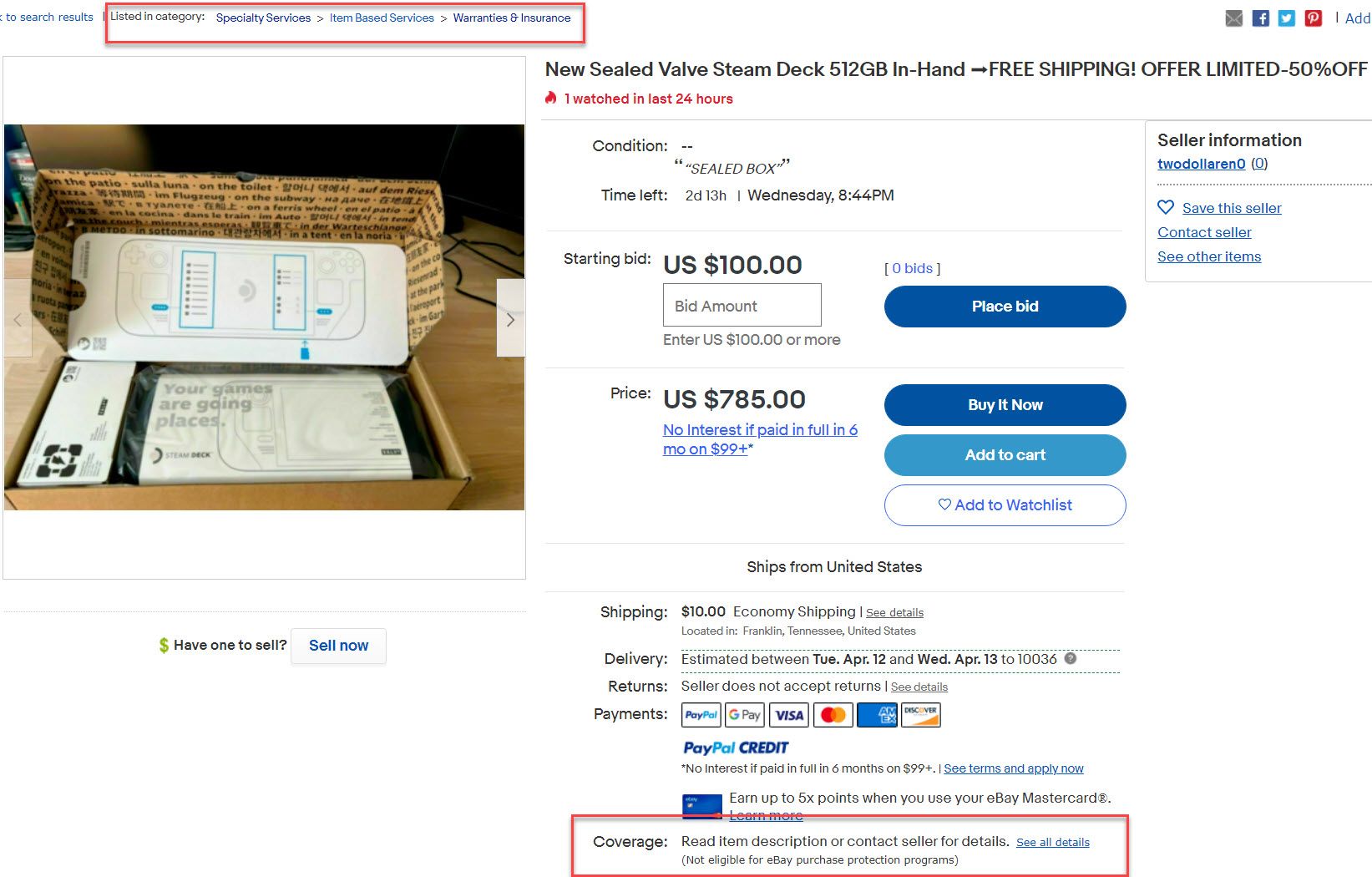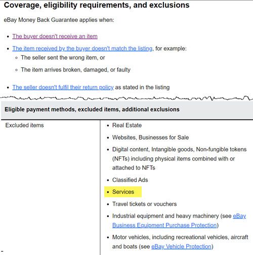 The Specialty Services categories are not covered by eBay's Money Back Guarantee, so when the buyer eventually realizes the seller never really had the item, they are unable to open an Item Not Received case or file any kind of claim through eBay.