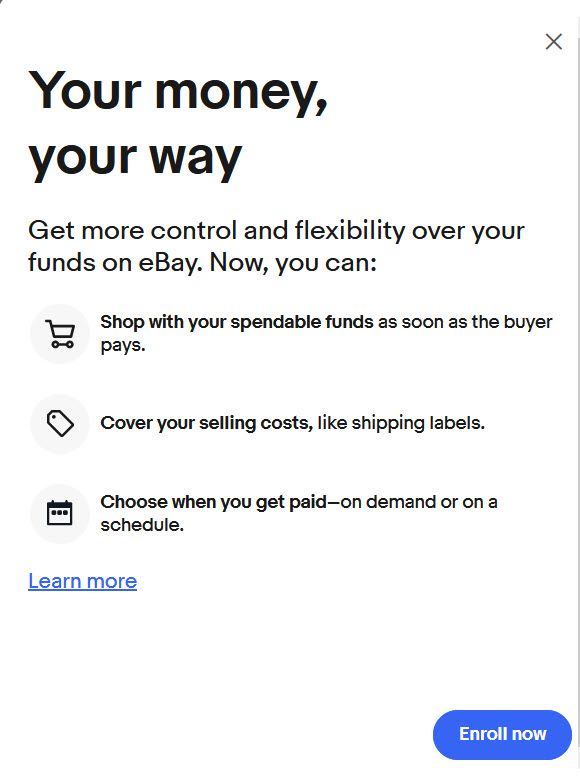 If you’re eligible to sign up for spendable funds, we’ll send you an invitation. To sign up, select the link in your invitation email, or select Enroll now in the notification in My eBay or Seller Hub. You’ll need to ensure you’ve enabled 2 step verification on your account, and agree to the terms and conditions to complete sign up.
