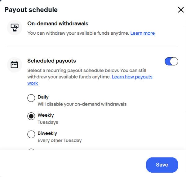You can also schedule your payouts to daily, weekly, biweekly, or monthly through the Payments tab in Seller hub and selecting Payout Settings.