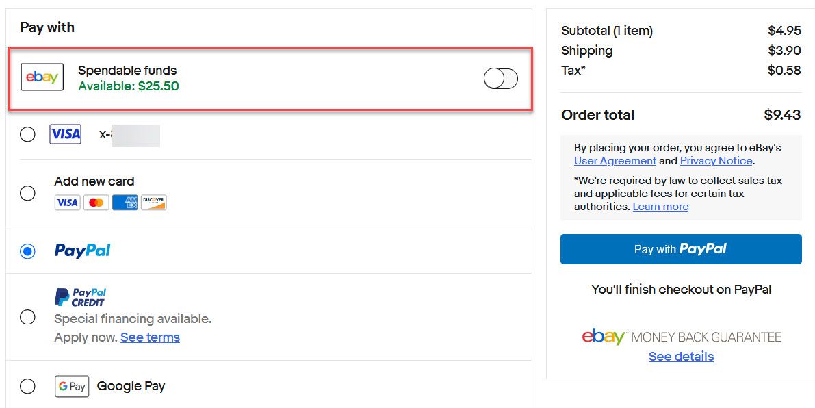 There may be some situations where Spendable Funds is not an available payment option and it looks like eBay is capping the maximum amount you can use from Spendable Funds at $2,000/transaction and/or $10,000 in a 30 day period.