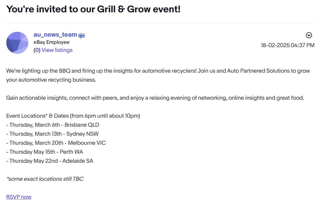 eBay Australia is also hosting a few in person events next month, aimed at sellers in the auto recycling business.