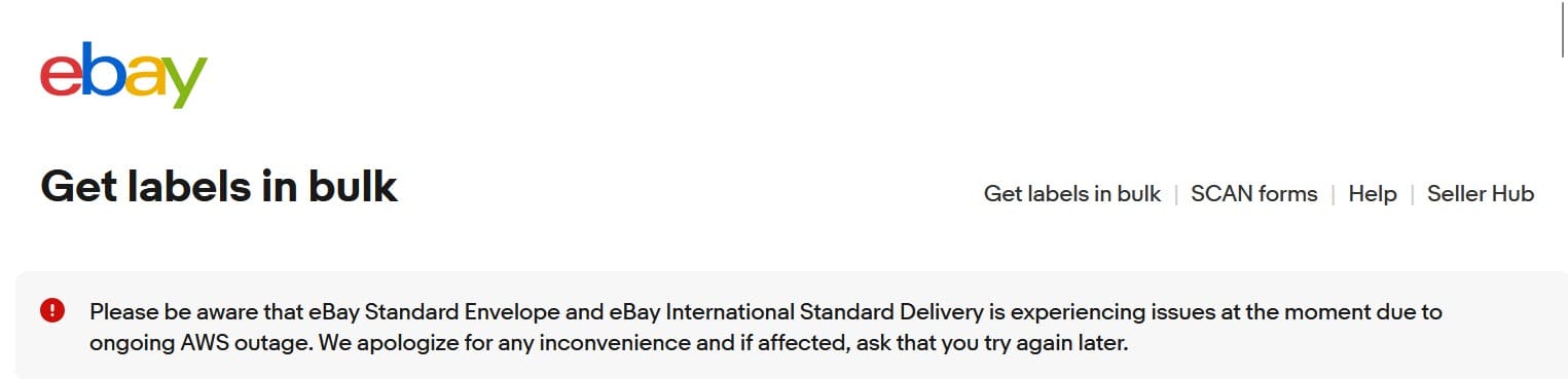 eBay updated the error message being shown on the label purchase screen later in the afternoon to confirm that the disruption was in fact related to the massive outage experienced by Amazon Web Services (AWS) today.