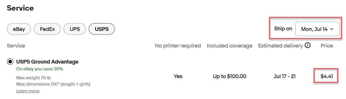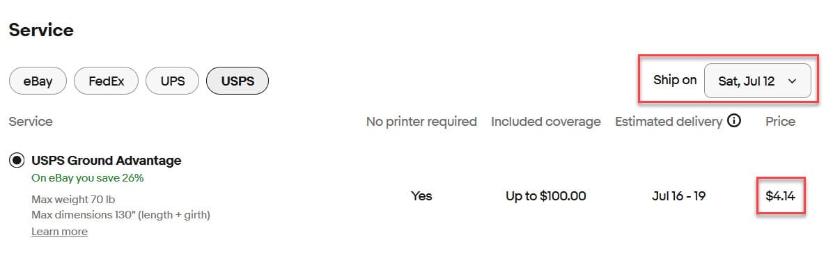 But many of the sellers reporting this issue today said they have checked and their eBay Standard Envelope shipments are correctly showing a Ship On date of July 12th, but still incorrectly showing the higher rate when purchasing the label.