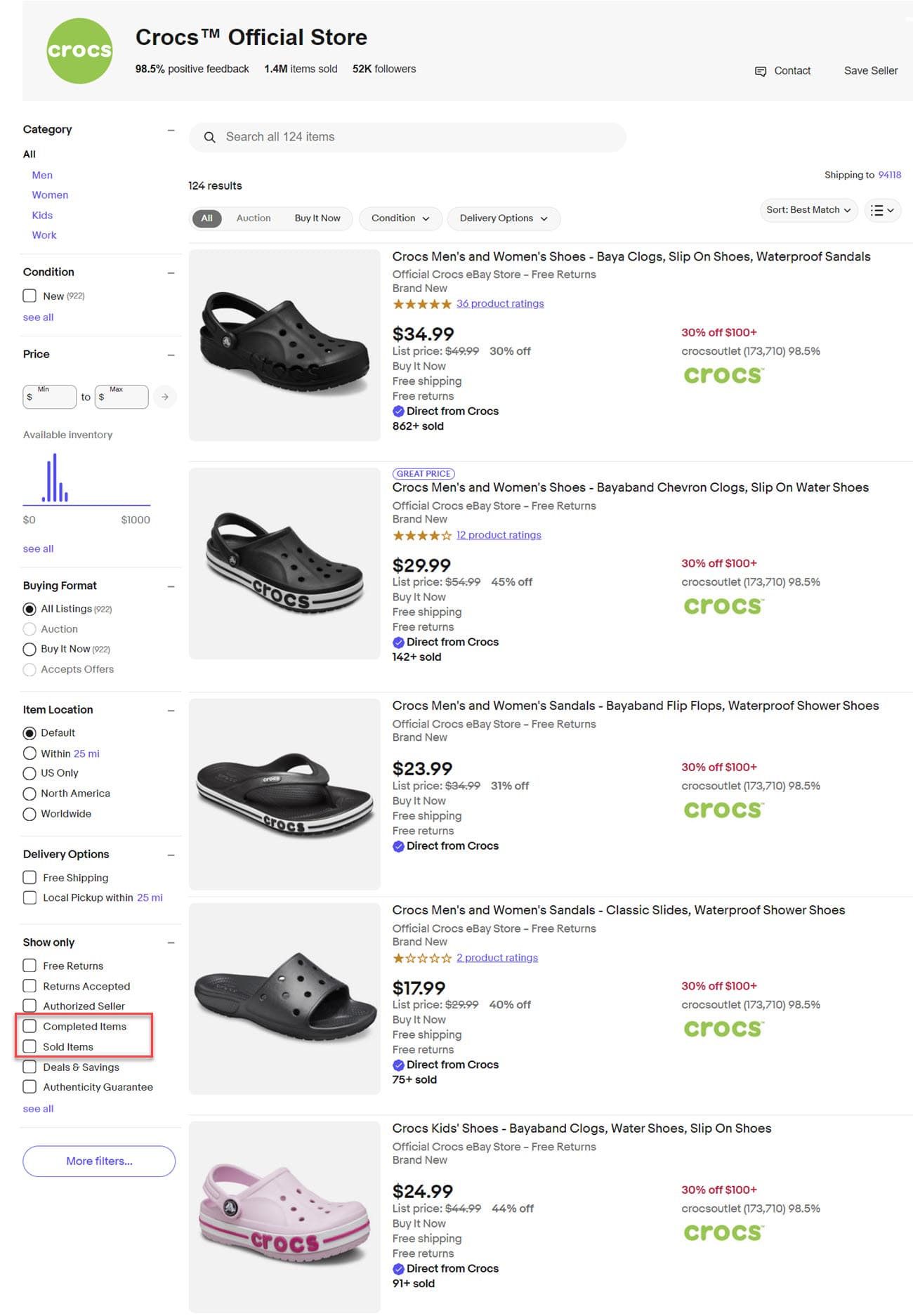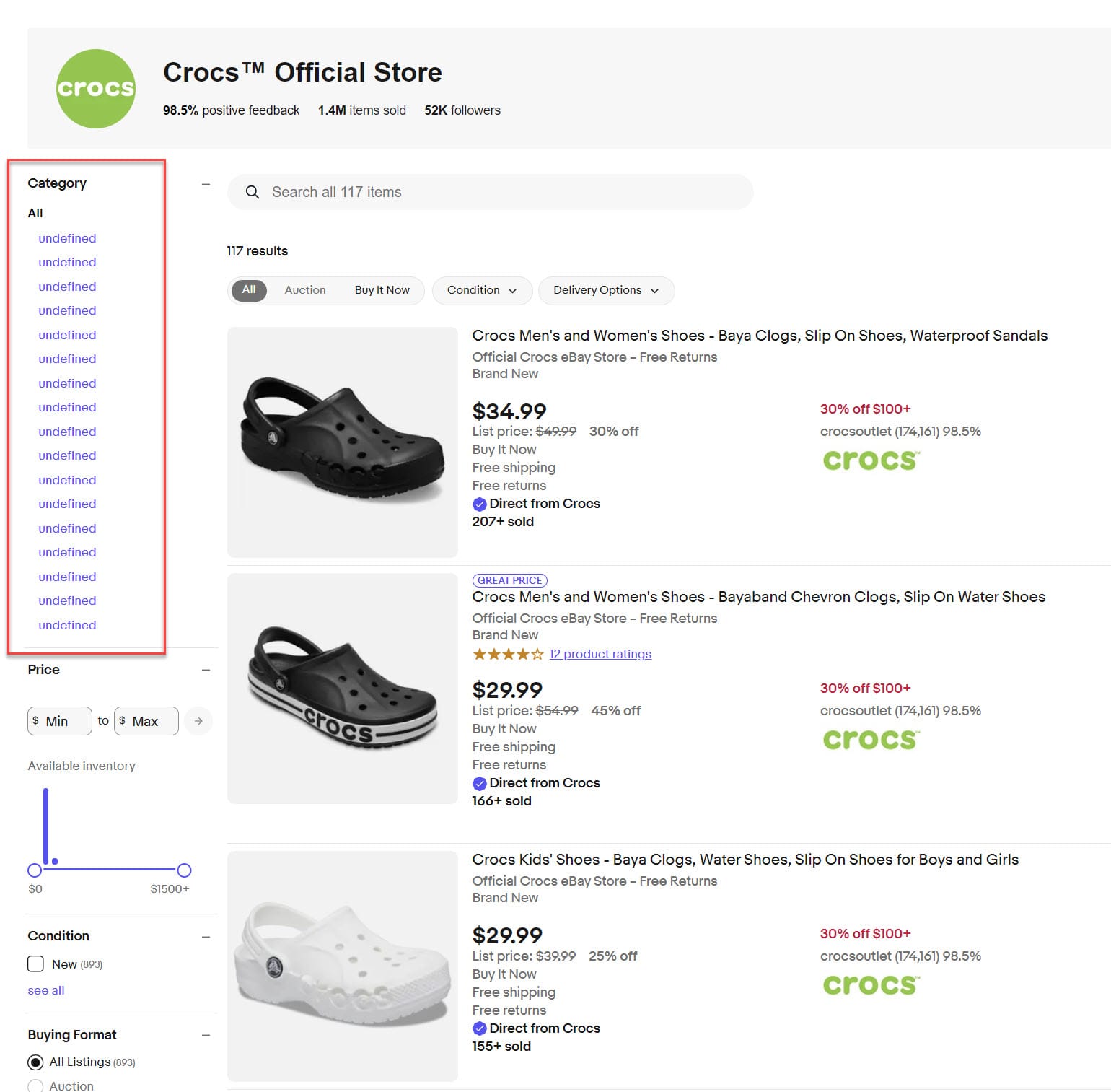 Previously, if you navigated to "see all items" from a seller's store page, eBay showed a left navigation panel with a category list, filters, and other features.