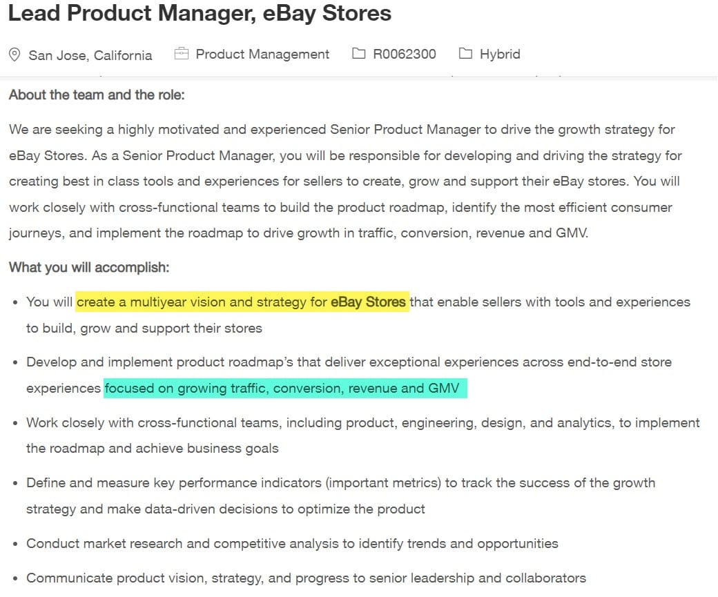 The job description is telling both for the fact that it reveals eBay still has years worth of work yet to do on Stores and that it admits the company is under increasing pressure to grow traffic, conversions, revenue, and Gross Merchandise Volume (GMV).