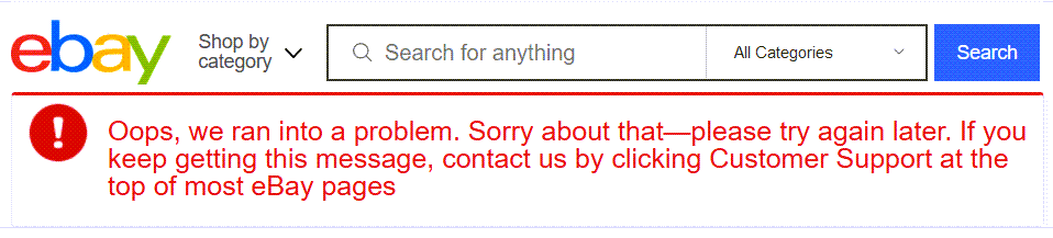 "Oops, we ran into a problem. Sorry about that—please try again later. If you keep getting this message, contact us by clicking Customer Support at the top of most eBay pages"