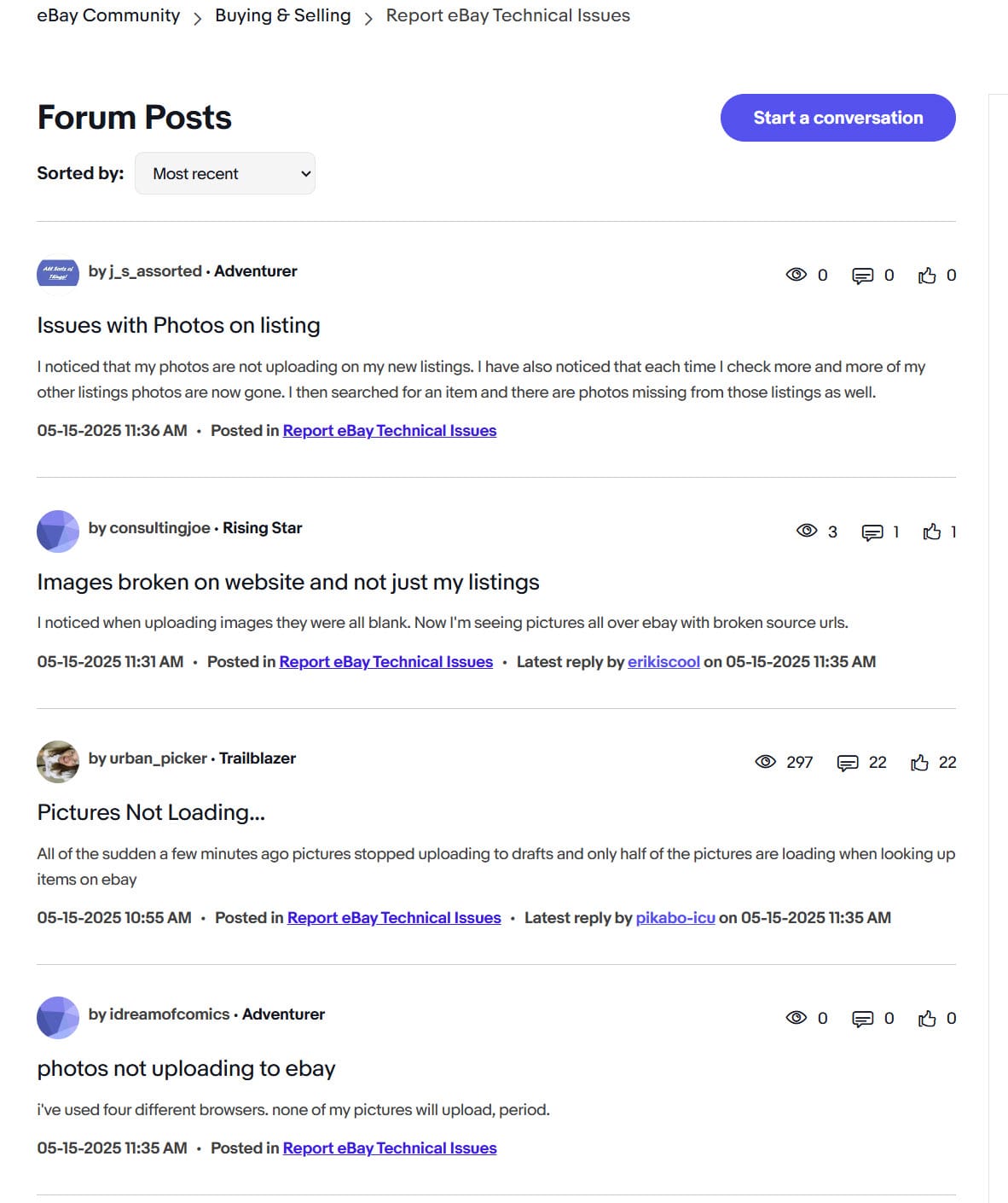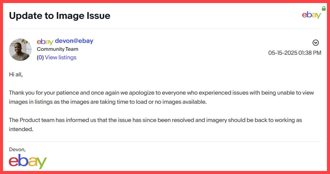 Complaints have been flooding into the eBay community saying all of their listing photos are currently not being displayed.