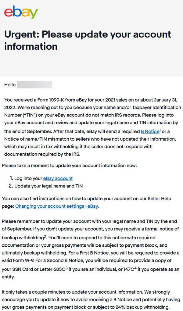 Some sellers have received a confusing message from eBay stating the IRS says their tax payer ID number does not match what eBay has on file and requiring a W9 form to be submitted or else they may have to withhold up to 24% of the seller's funds.