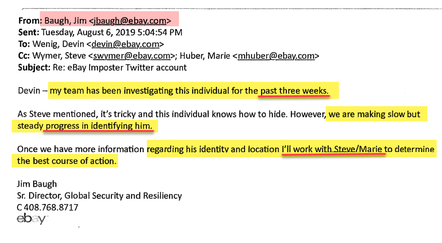 Both Oh Huber and Aaron Johnson participated in some troubling email exchanges that were revealed in the cyberstalking case as then CEO Devin Wenig, Chief Communications Officer Steve Wymer and Security Director Jim Baugh discussed how to handle the perceived "problem" of the Steiners coverage and Fidomaster/unsuckEBAY, an anonymous Twitter user who was a frequent EcommerceBytes commenter and source which sparked the ire of top executives at the company.