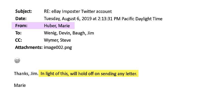 The email chain started with Wenig expressing his desire to see the unsuckEBAY Twitter account shut down - assigning the task to Baugh, with Oh Huber and Wymer copied.