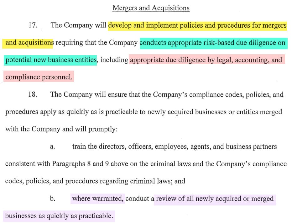 The deal hit the company with the maximum fine of $3 Million dollars and will require enhanced compliance monitoring for 3 years, including a specific focus on Mergers and Acquisitions due diligence, disclosure and risk management.