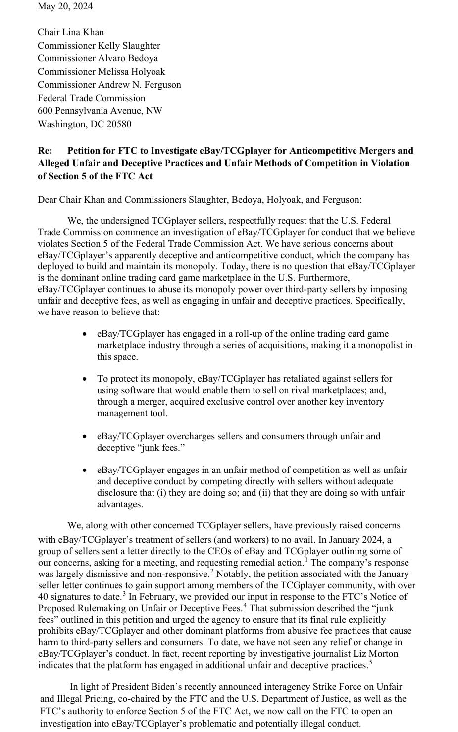 Read the full petition urging the FTC to investigate eBay/TCGplayer here:
