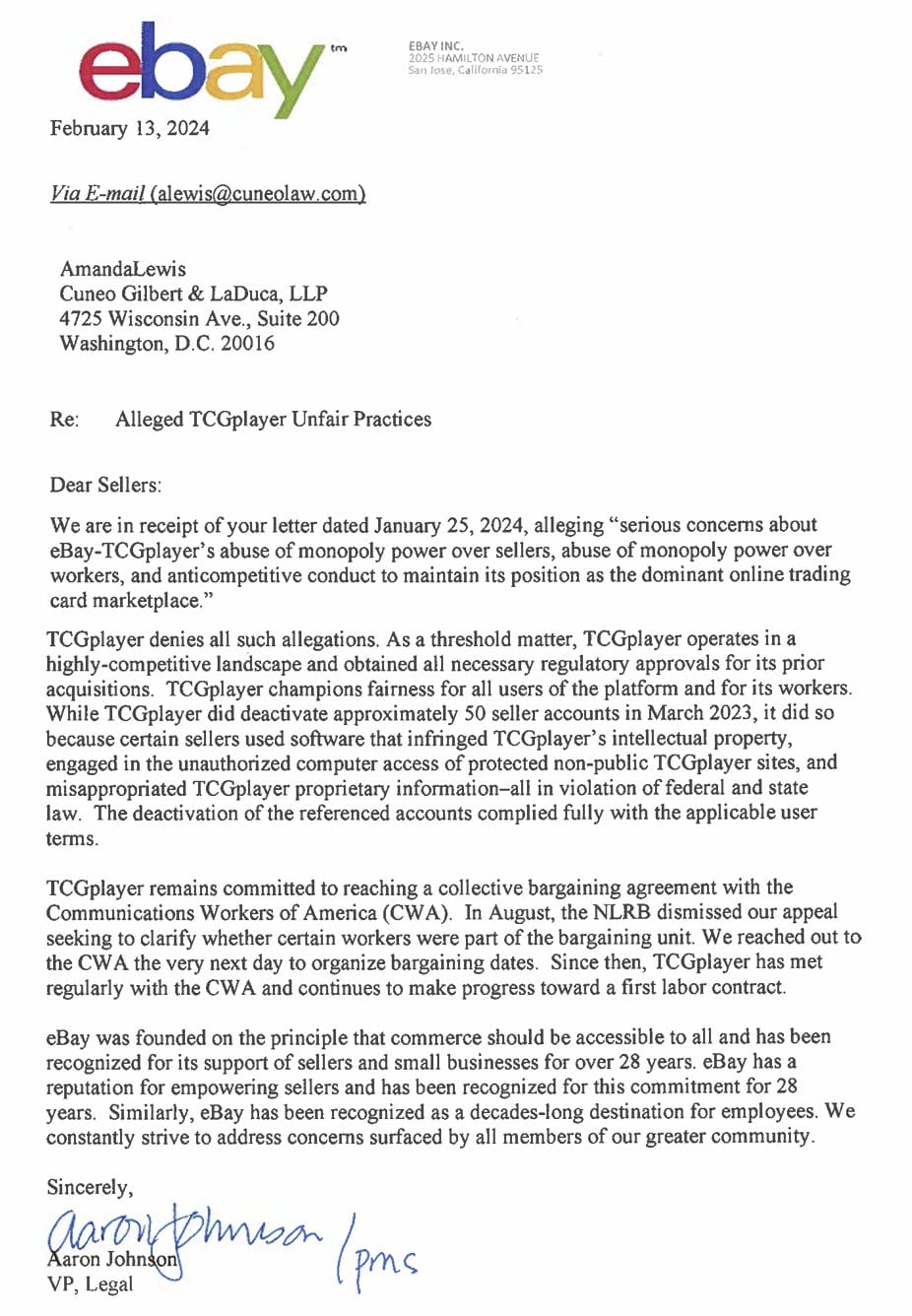The letter also raised concerns about eBay TCGPlayer's treatment of employees, particularly authentication workers who voted to form eBay's first US union last year, and the company's ongoing delays in bargaining and union-busting activities which resulted in new Unfair Labor Practice charges being filed with the National Labor Relations Board just last week.