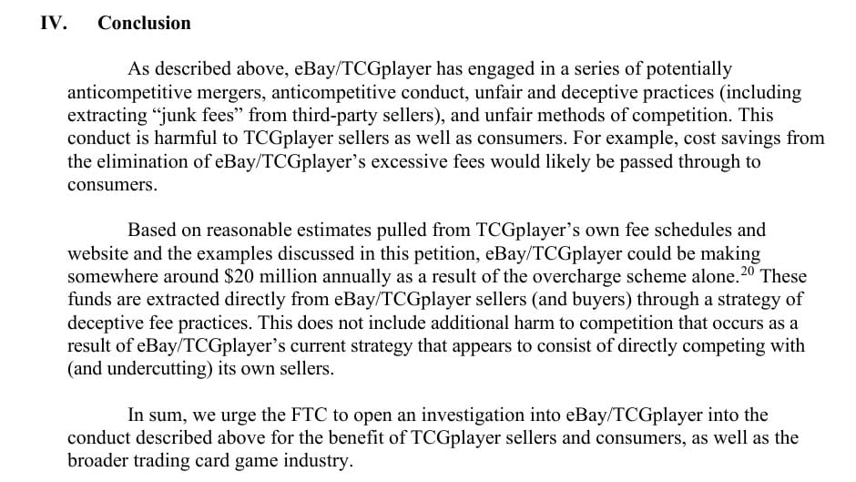 The FTC petition concludes by saying the potentially anticompetitive mergers, anticompetitive conduct, unfair and deceptive practices, and unfair methods of competition are harmful to TCGplayer sellers as well as consumers and estimates eBay/TCGplayer’s overcharge scheme alone could represent about $20 million annually that would likely be passed through to consumers if it was eliminated.