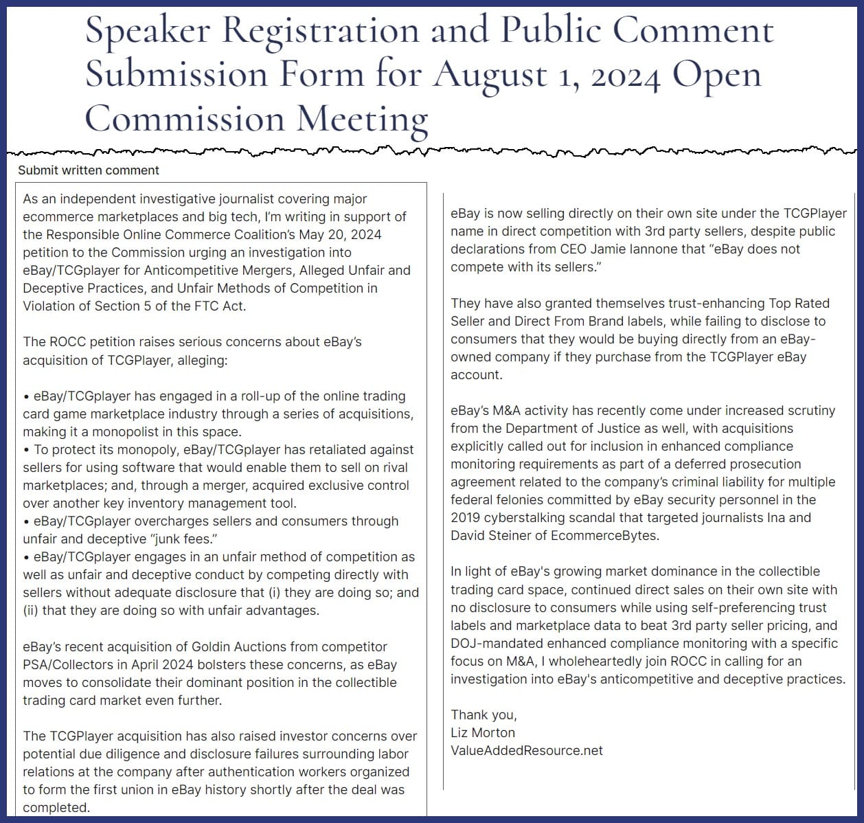I have submitted the following public comment for today's FTC Open Meeting in support of the Responsible Online Commerce Coalition's petition to investigate eBay/TCGplayer for Anticompetitive Mergers, Deceptive Practices & Unfair Methods of Competition.