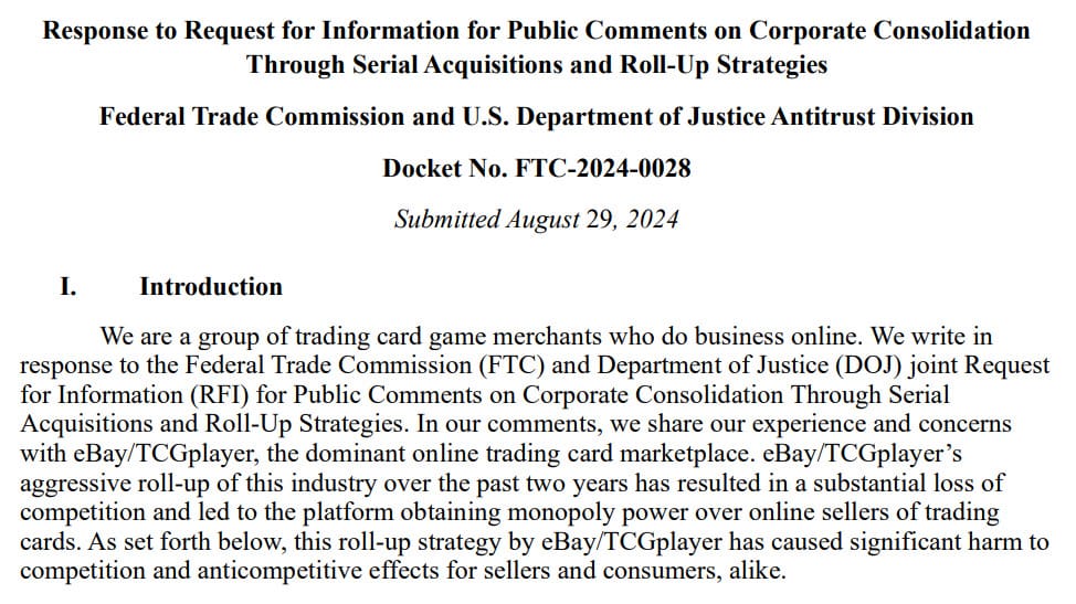 eBay TCGPlayer Sellers Urge FTC, DOJ Investigation In Comments On Corporate Consolidation & Roll-Ups