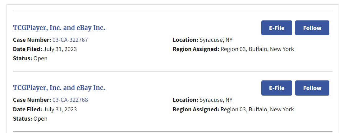 TCGUnion-CWA has also filed two new complaints with the National Labor Relations Board naming both TCGPlayer Inc and eBay Inc.