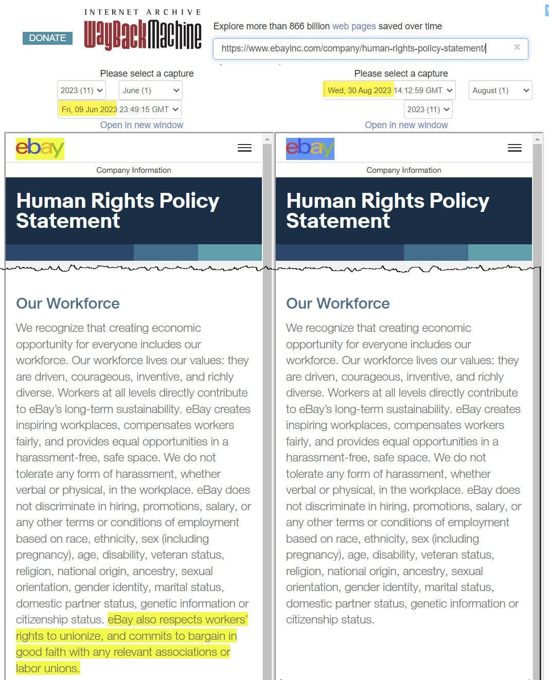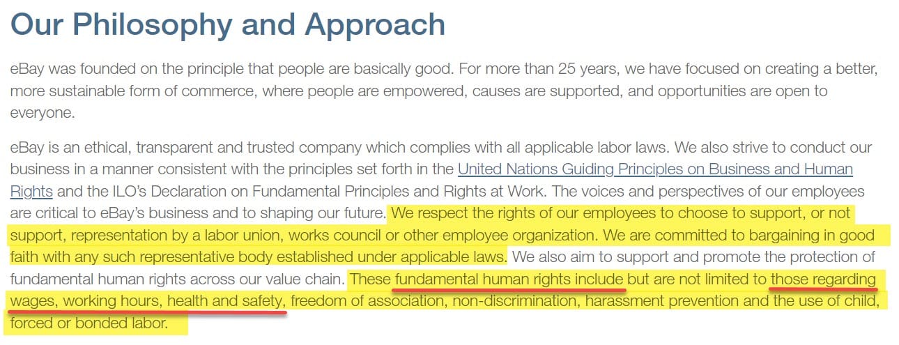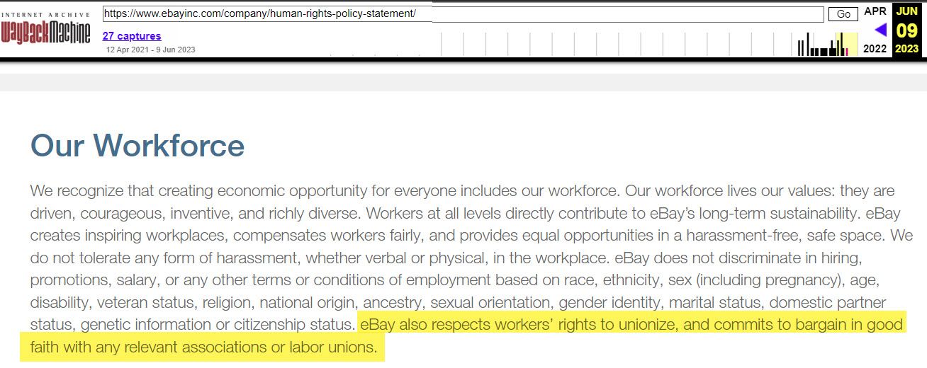 At the time, eBay's Human Rights policy page had a section that said: "eBay also respects workers’ rights to unionize, and commits to bargain in good faith with any relevant associations or labor unions."