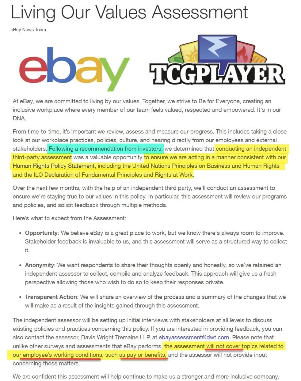 Curiously, the statement says the assessment will not cover topics related to employees' working conditions, pay or benefits - all of which could be critical measures of whether or not eBay is living up to their Human Rights Policies as a whole and specifically in regard to unionized workers at TCGPlayer.