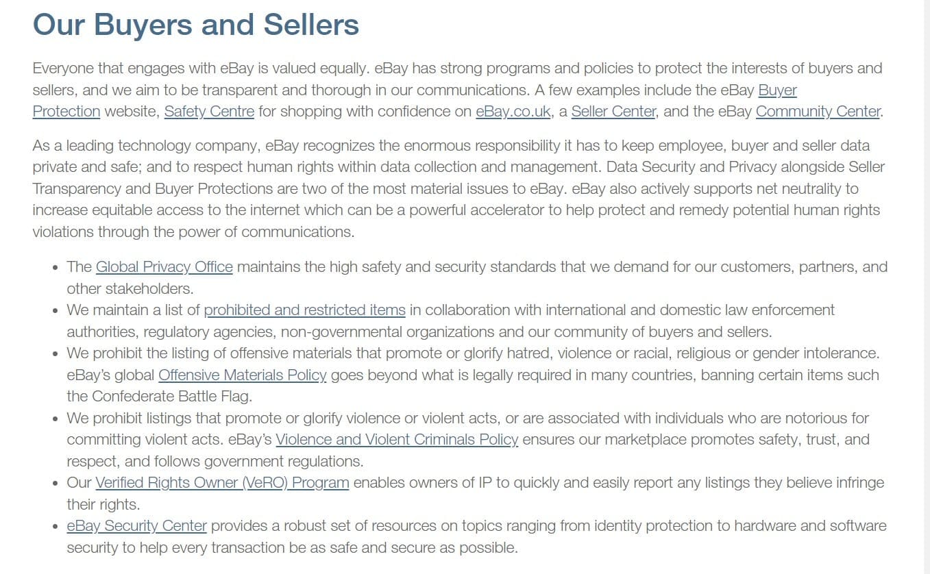 Buyers and sellers may also be interested in what the Human Rights Policy has to say about eBay's obligations and responsibilities to users as well.