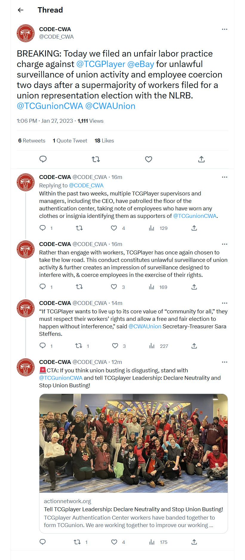 I join TCGunion-CWA in calling on TCGplayer management: stop union busting and respect your worker’s right to organize free from intimidation by signing a neutrality agreement with TCGunion-CWA.