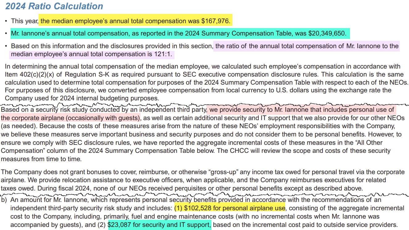 Iannone's compensation package also includes security provisions for IT support/expenses and personal use of the corporate airplane (occasionally with guests.)