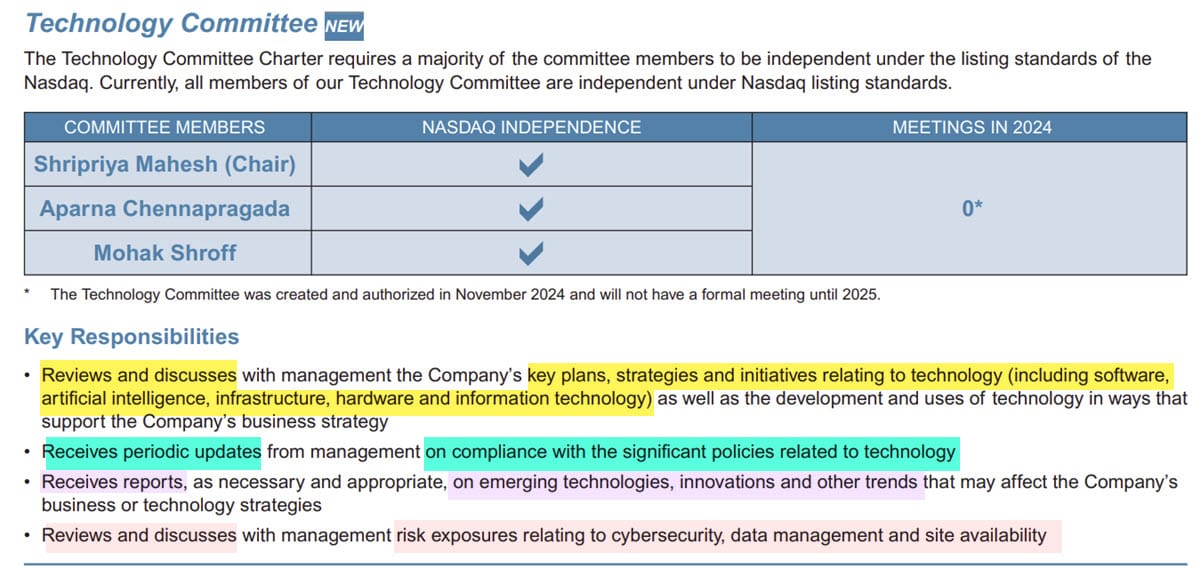 Strangely, Shripriya Mahesh was chosen to chair this new Technology Committee despite being the least technical of the three members.