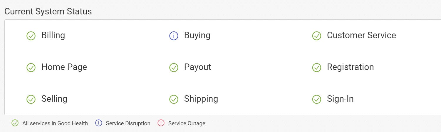 Surprisingly, eBay's System Status page is actually showing a disruption for once...unsurprisingly, it is only showing a disruption to Buying when in fact most of the reports being made to the eBay community are about almost everything except buying being broken.