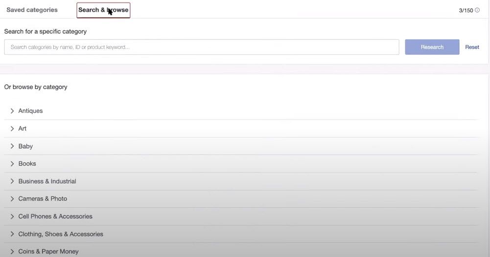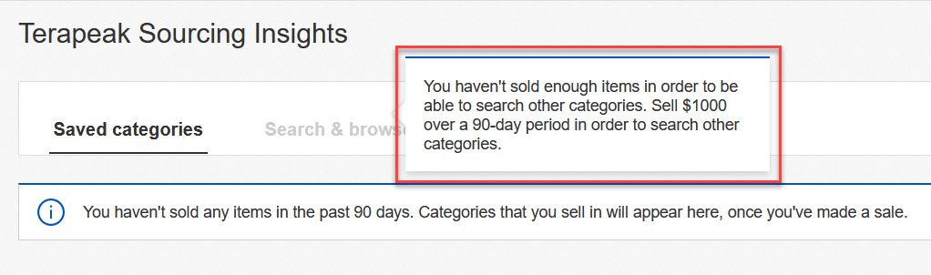 However, sellers who are unable to access the tool report getting this message when trying to click on the "search and browse" tab. I also see it when trying to view data for international eBay sites - so currently it appears you can only get data for eBay sites and categories where you have $1000+ in sales in a 90 day period.