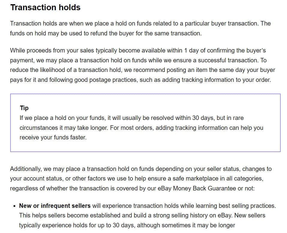 New UK sellers may find their funds on hold for up to 30 days, with eBay highly recommending that add tracking information may help them to received their funds faster.