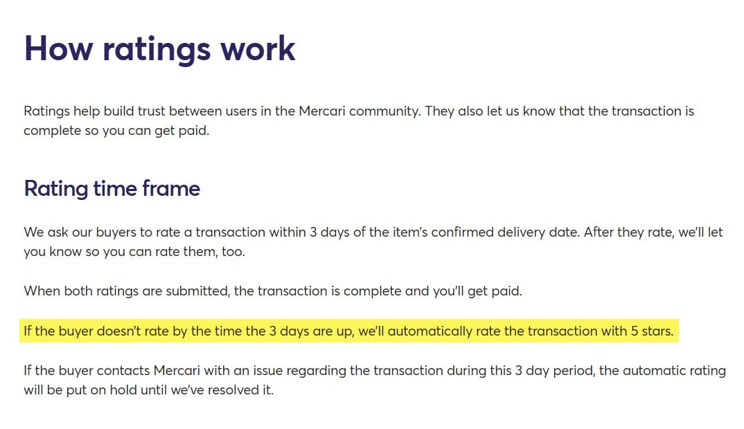 Competing marketplace Mercari places funds on hold until both buyer and seller rate the transaction - or if the buyer does not submit a rating within 3 days, the platform will post an automatic 5 star rating for the seller to complete the transaction and release payment.