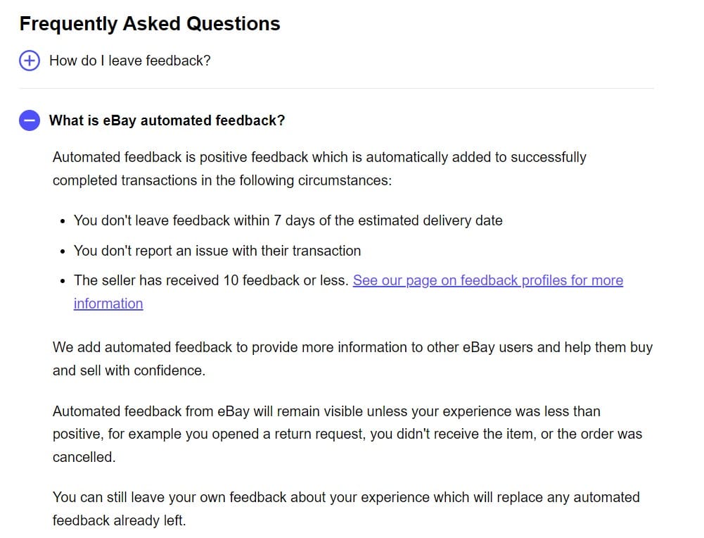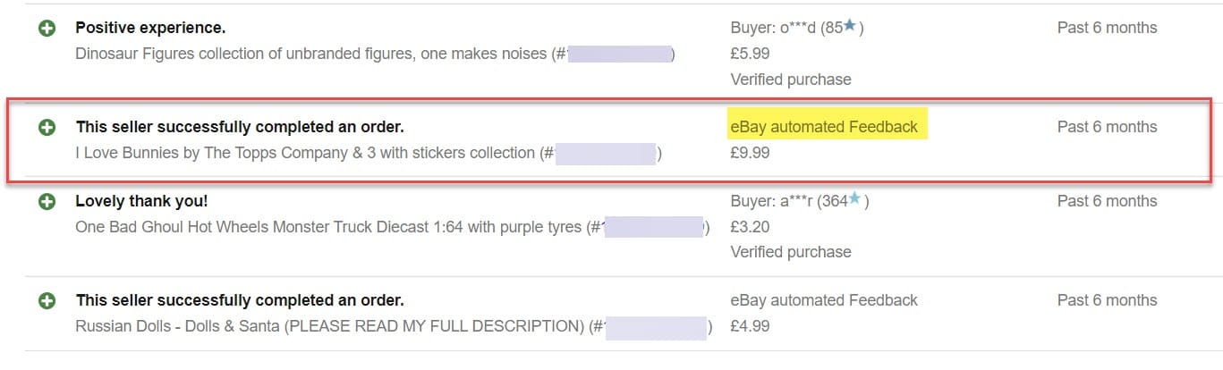 On your feedback, after a period of time if the buyer hasn’t left you feedback, it shows as “eBay automated feedback” (instead of the buyers username), comment is “this seller successfully completed an order” and it shows the item purchased.