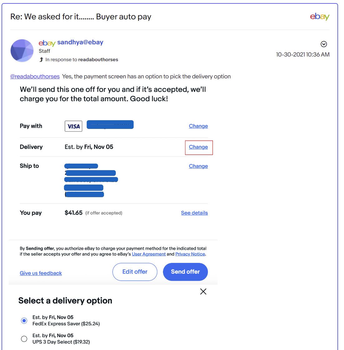 Sandhya also confirmed that buyers are presented with options to change shipping method and shipping address before committing to the offer.