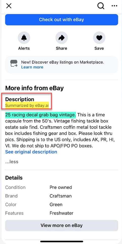 Sellers were also concerned when they started seeing eBay AI generated description summaries appearing for their items shown on Facebook Marketplace as part of Meta partnership announced earlier this year.