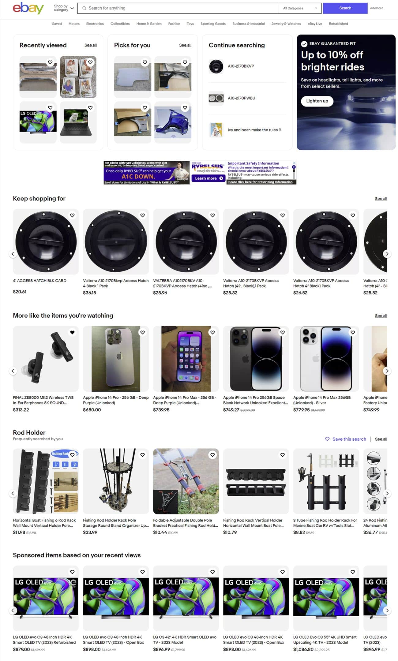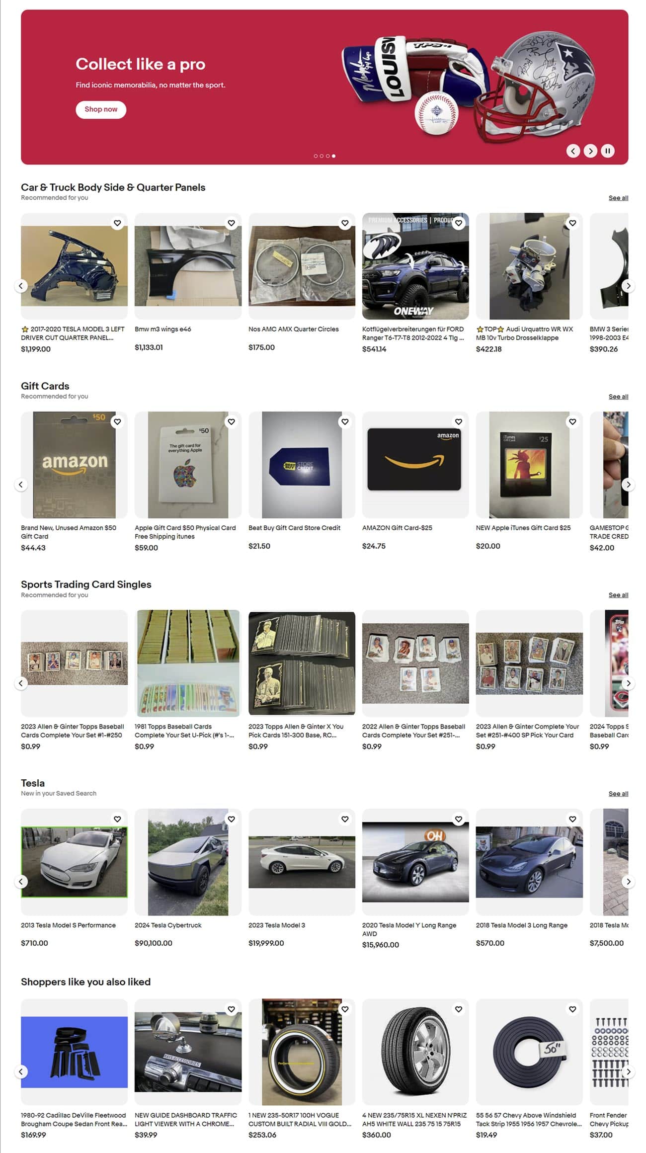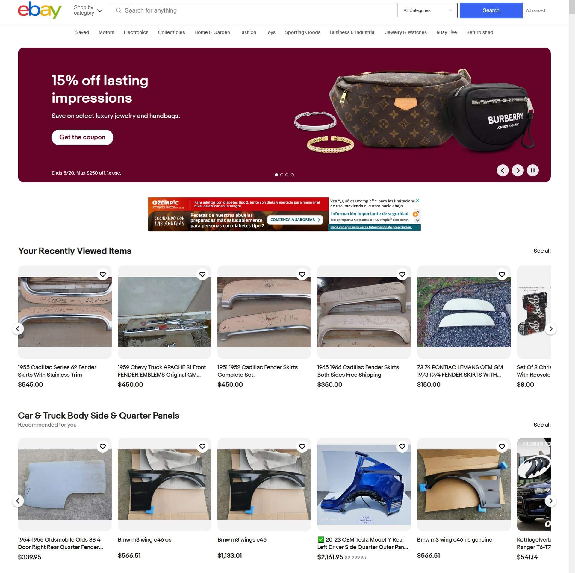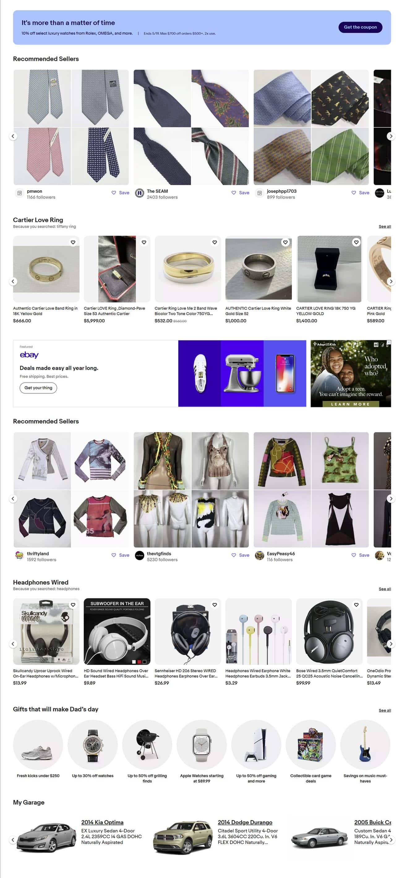 Then another banner with a coupon for Luxury Watches followed by Recommended Sellers, more recommendations based on past searches, gift suggestions, and My Garage.