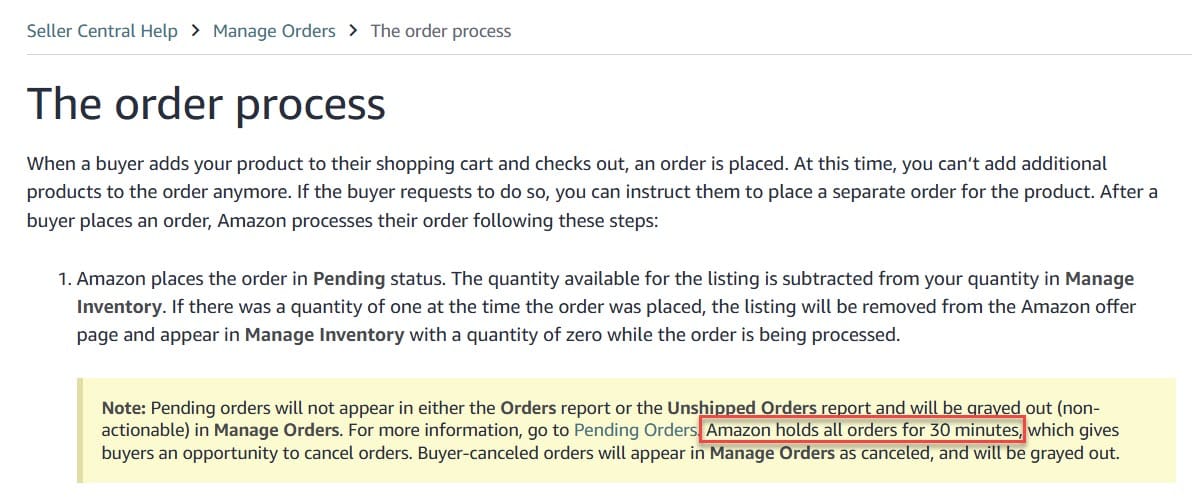 That process may work for many sellers on Amazon because they are more likely to be selling new consumer goods with multiple quantities in stock, so the disruption from the 30 minute hold is minimal.