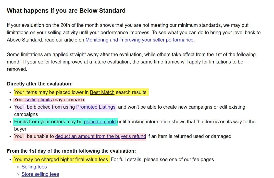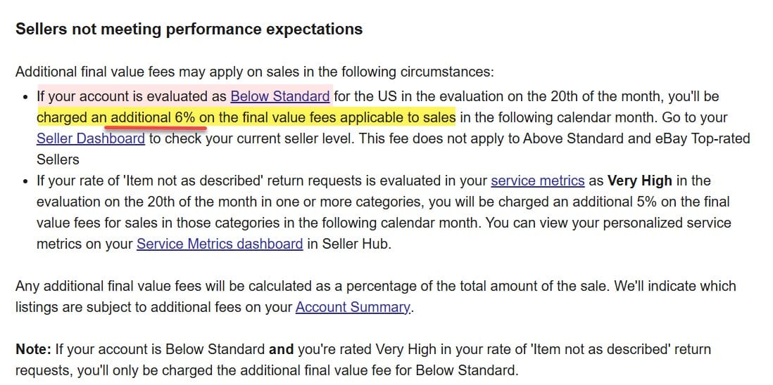 If that happens, eBay can and will apply a host of negative consequences including lower search rankings, reduced selling limits, funds on hold, limited access to features and an additional 6% fee on top of the regular Final Value Fee for subsequent sales.