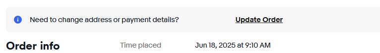 The user subsequently followed up with screenshots of what they are seeing, clearly showing the existence of an "update your order option" showing on both the order confirmation page and in their purchase history order details page.