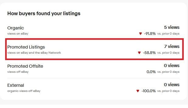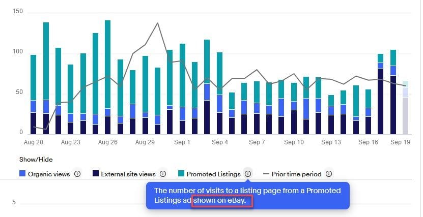 Promoted Listings is now defined as "total visits to your listings on eBay from your Promoted Listings campaigns." Because this specifies on eBay placements only, that rules out any external placements being included in this stat.
