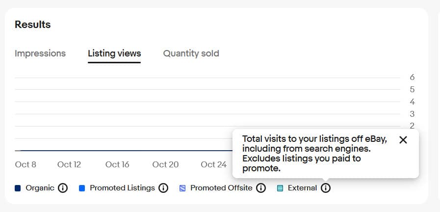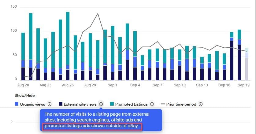 And External Site Views as "visits to a listing page from external sites, including search engines, offsite ads, and promoted listings ads shown outside of eBay."