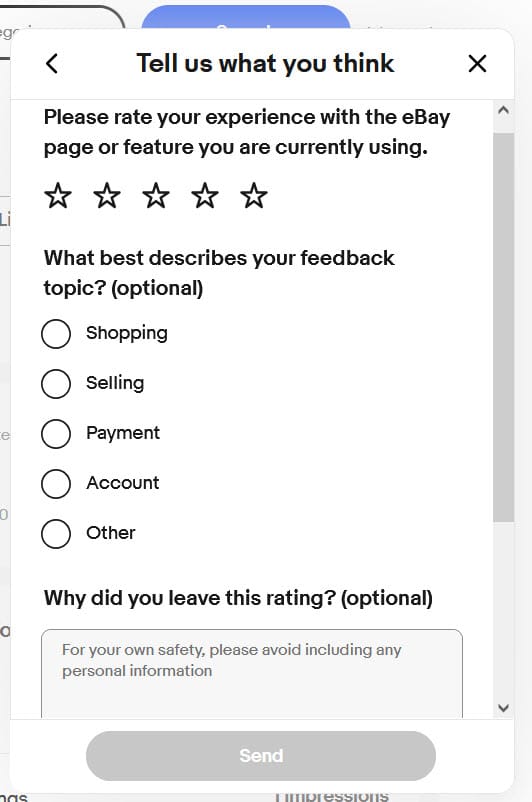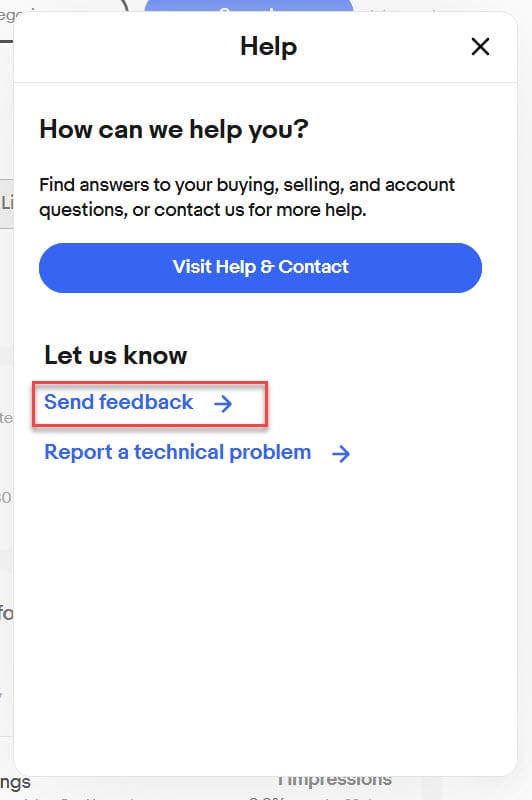 Sellers are encouraged to provide feedback about the new Traffic page design directly to eBay by clicking the floating question mark in the bottom right of the screen and clicking the "Send feedback" link.