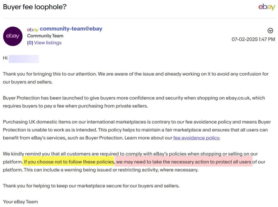 And in one of the few UK community threads on this topic allowed to continue, eBay staff are "reminding" users that if they do this, eBay might just have to suspend their accounts - because, threats are a great way to engage with your customers, right?